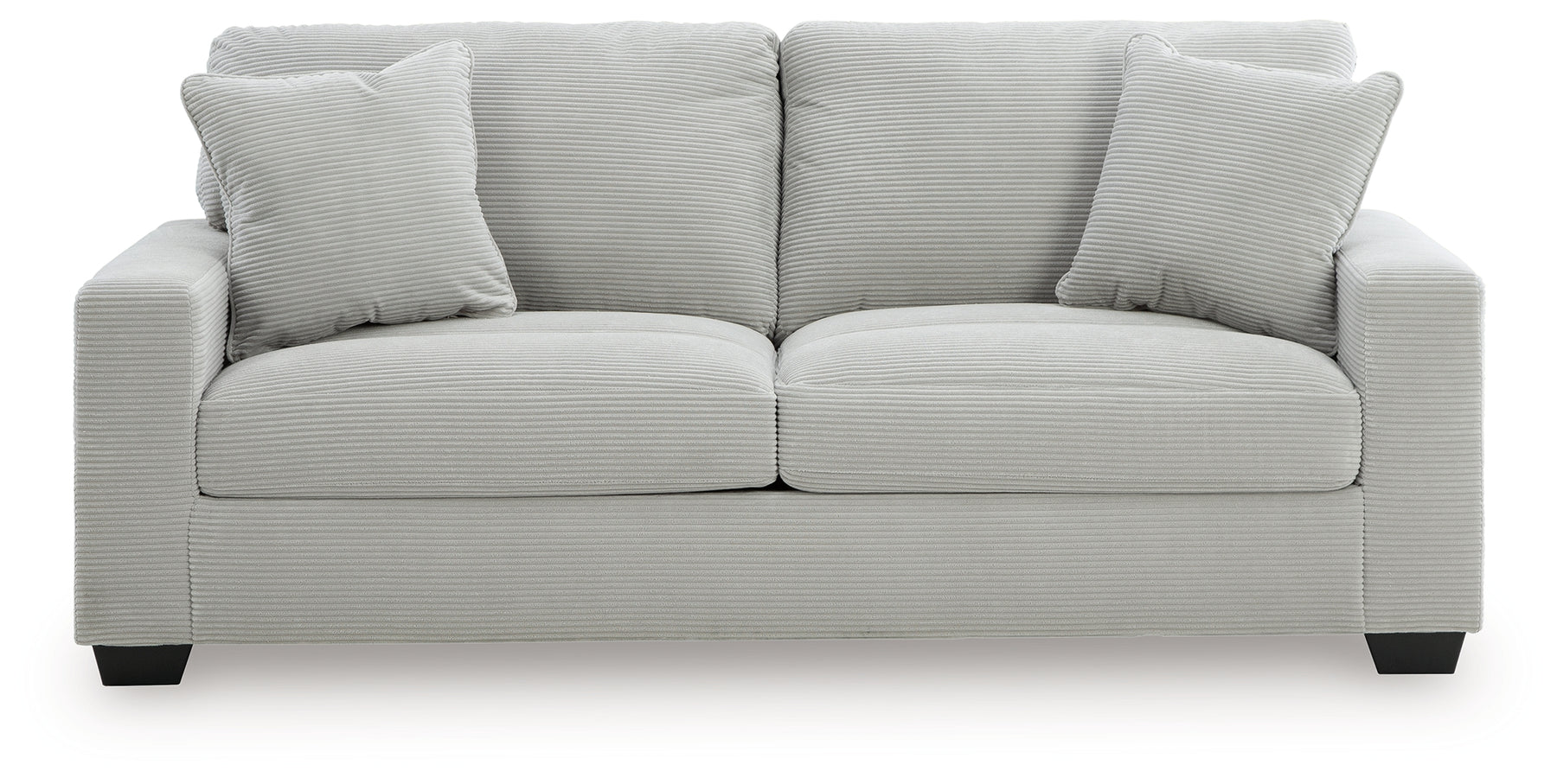 The crisp neutral hue and striking design details of this sofa create a living room that expertly reflects your modern taste. For irresistibly cool textural appeal, the ultra-soft fabric is enhanced by a small-scale corded look. With a clean-lined silhouette complete with track arms, this sofa allows you to take a trend-right approach to everyday living.